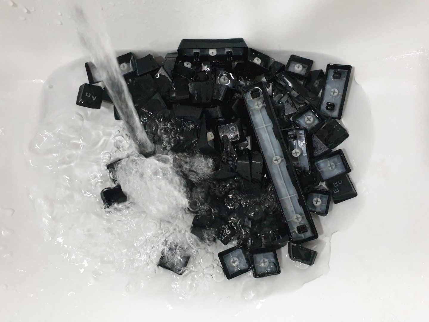 두번째로 할 일은 키캡 청소입니다. 마찬가지로 간단한 작업으로, 미온수를 받아두고 물에 때를 불려 씻어내면 되는 것이지요.
