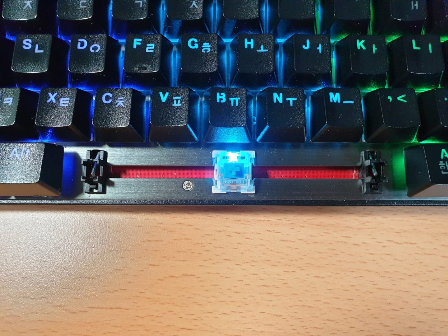 한성 MKF14S는 키캡에 고른 힘이 가해지기 위해서 스테빌라이저를 채택하고 있습니다. 즉, 키캡의 어디를 누른들 해당 버튼이 정확히 입력 될 수 있도록 도움을 주는 것이지요.