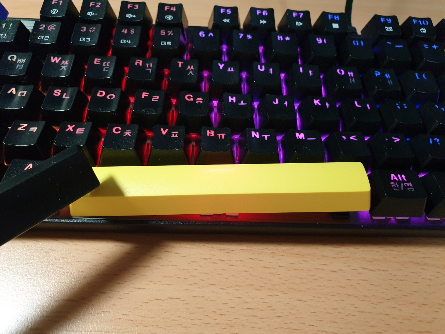 스페이스바를 제외한 엔터키나, 백스페이스키에도 스테빌라이저가 필요로 되어있기는 하지만, 다행히 해당 키들은 좌우 폭이 좁아서 그런지 스테빌라이저가 없어도 제대로 키 입력은 되더라구요. 그래서 현재에는 노란 스페이스바를 제외한 다른 키들을 적용하여서 활용하고 있습니다.